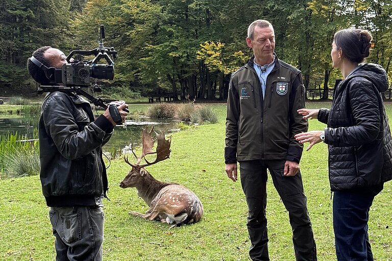 Foto (@Stadt Landsberg): Das Filmteam von München TV zusammen mit Forstamtsleiter Michael Siller im Lechpark Pössinger Au.