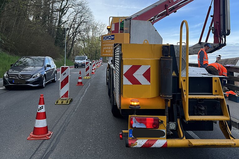 Dafür kommt ein spezielles Kranfahrzeug zum Einsatz, mit dem die Holzpfosten rückseitig an der Stützmauer neu verankert werden. Während der Bauarbeiten wird die Neue Bergstraße halbseitig gesperrt. Der Verkehr kann in beiden Fahrtrichtungen erfolgen, jedoch mit einer Ampelregelung.